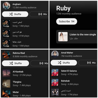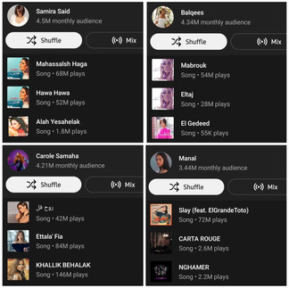 وفي المراكز التالية، جاءت شيرين في المرتبة الثانية بـ 74.4 مليون مستمع شهري، ثم نانسي عجرم بـ 61.7 مليون، بينما واصلت إليسا حضورها القوي محققة 59.3 مليون. كما برزت بيسان إسماعيل ضمن القائمة بـ 32.6 مليون، إضافة إلى أسماء أخرى لها تأثير كبير مثل أنغام (12.8M)، رحمة رياض (8.86M)، وأمل ماهر (7M).